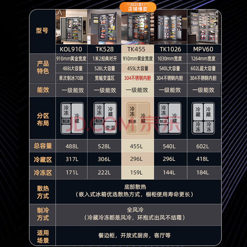 商品相册:Artaus阿塔斯455升对开门冰箱全嵌入式冰箱隐藏橱柜一体机900宽双舱一体底部散热零嵌入制冰不锈钢TK455第