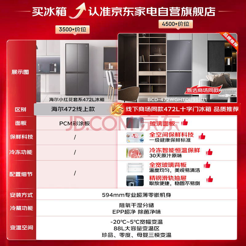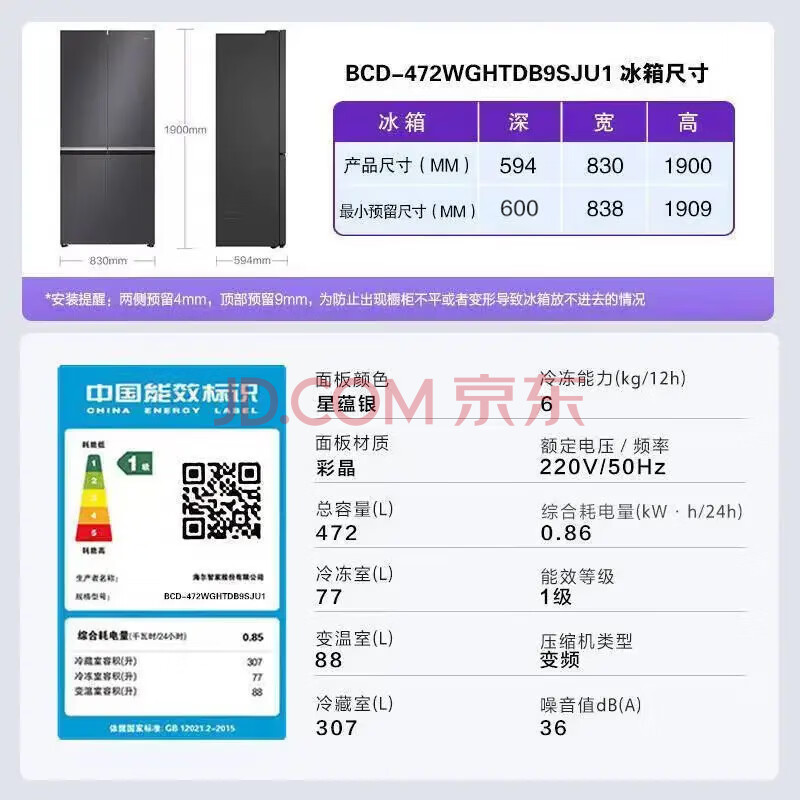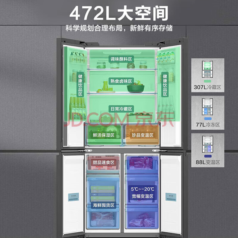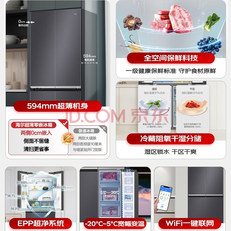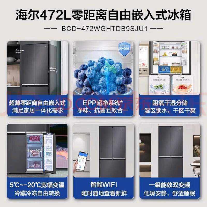 商品相册:海尔冰箱472升十字四开门玻璃门594mm超薄零嵌底部散热全空间保鲜一级能效BCD-472WGHTDB9SJU1第