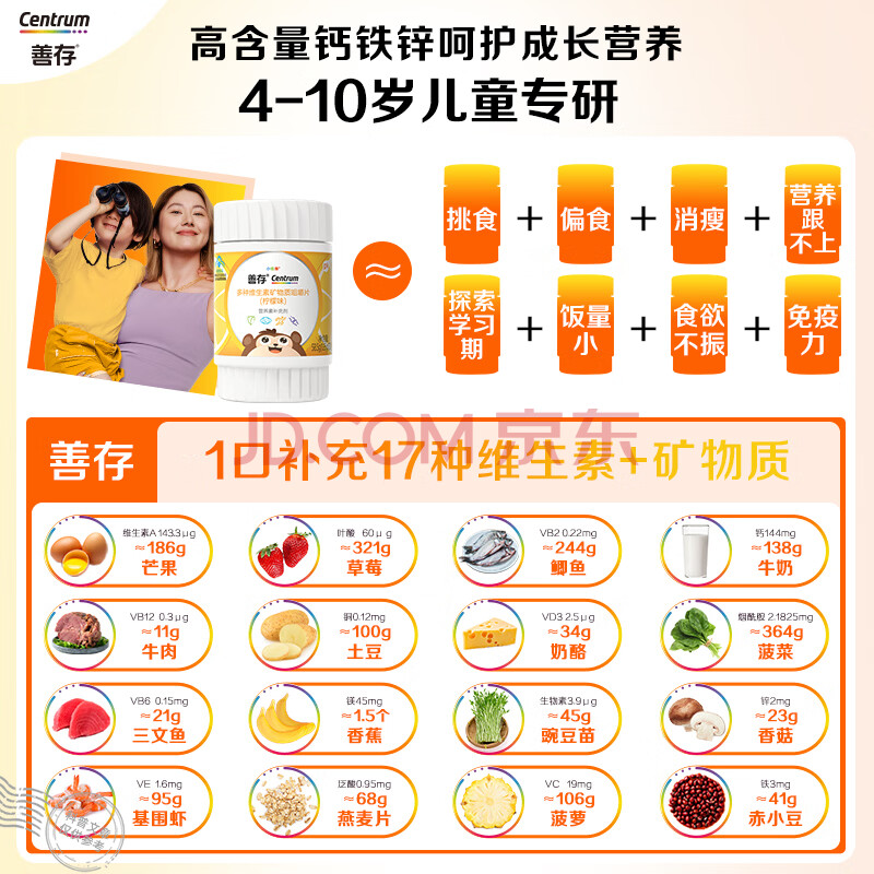 商品相册:善存儿童多种复合维生素补vd3+钙铁锌4-10岁b族维e维c30粒*4瓶第