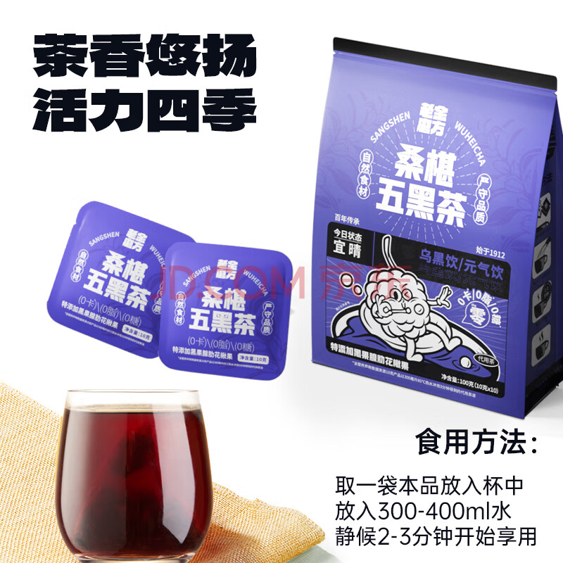商品相册:老金磨方桑椹五黑茶10袋装祛湿枸杞桑葚汁芝麻熬夜养生装肾补精冷萃泡100g第