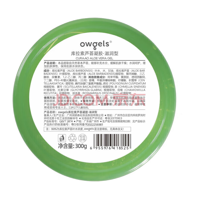 商品相册:owgels芦荟胶库拉索芦荟凝胶300g补水保湿晒后呵护天然芦荟膏乳液面霜第