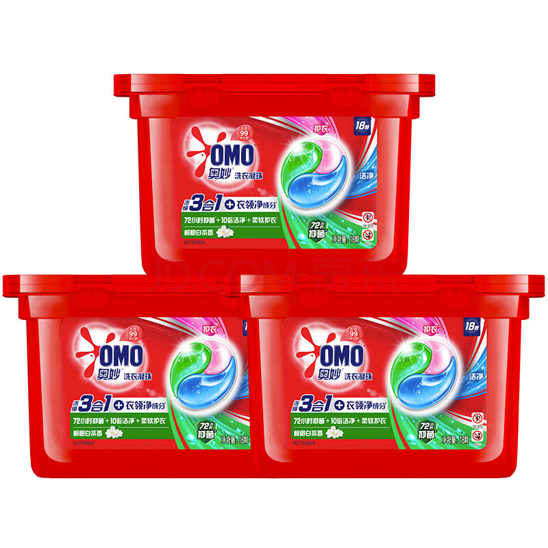 商品相册:奥妙(OMO)三合一洗衣凝珠54颗(18*3盒) 桉树香 长效抑菌留香第1张/共2