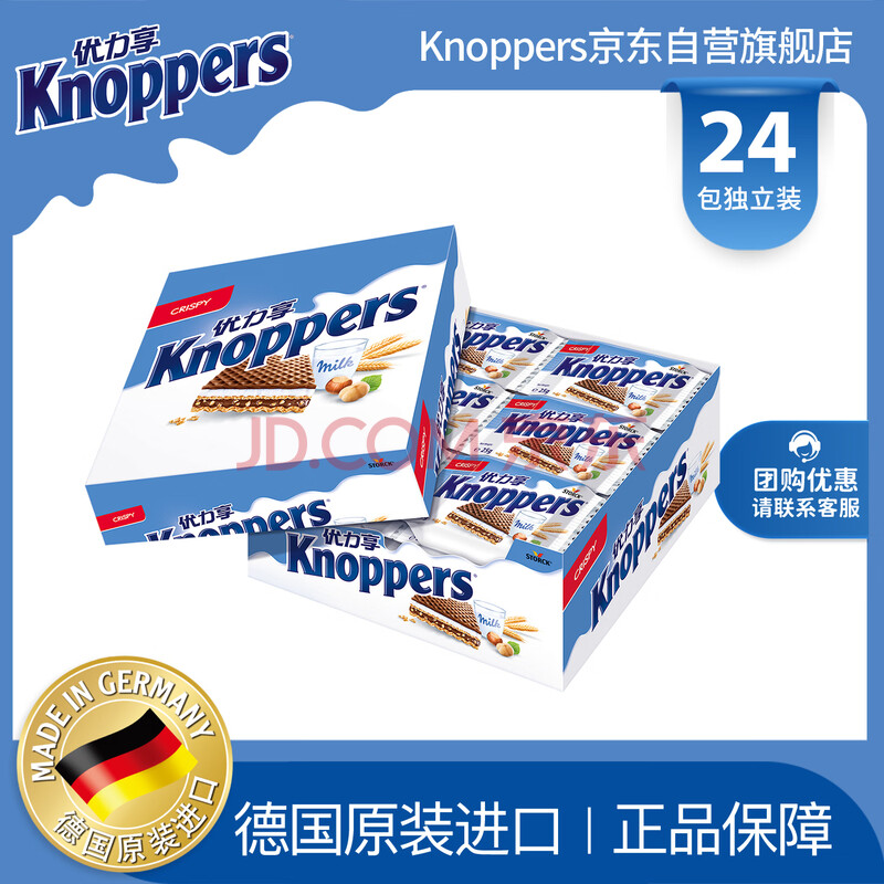 商品相册:Knoppers优力享德国进口牛奶巧克力榛子威化饼干24包600g夹心饼干零食礼盒第