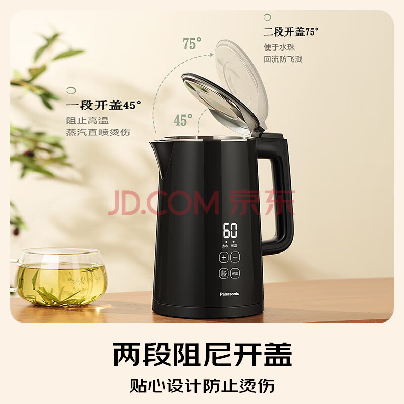 商品相册:松下(Panasonic)电热水壶 黑色 1.5升 实时显温 多段温控 304不锈钢内胆 保温烧水壶NC-TD151 第