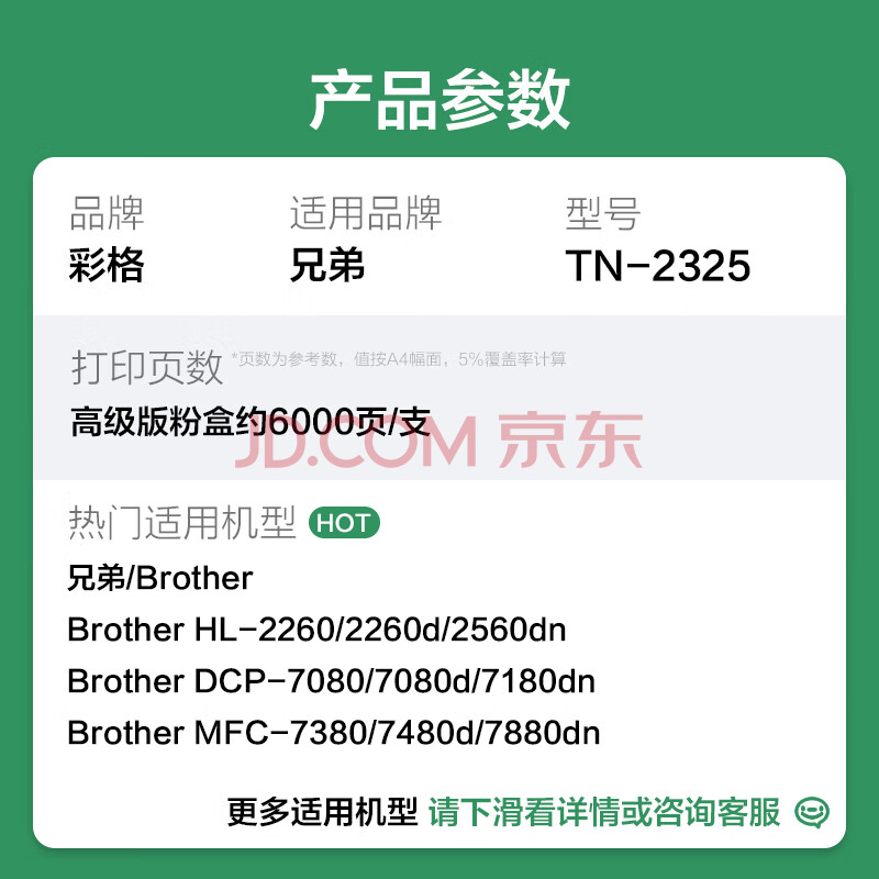 商品相册:彩格TN2325粉盒适用兄弟打印机墨盒MFC-7380 DCP-7080D DCP-7180DN HL-2260D TN-2312打印机硒鼓墨粉盒1支第