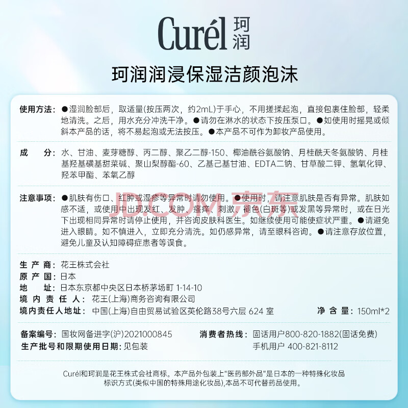 商品相册:珂润(Curel)保湿洁面泡沫150ml*2 氨基酸洗面奶温和清洁敏感肌男女士京东自营第