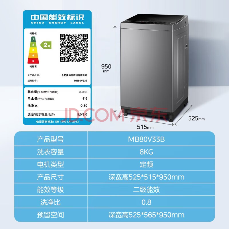 商品相册:美的(Midea)波轮洗衣机全自动 8公斤 内桶免清洗 优质能效 小身材大容量 含安装发货根据当地实际为准第